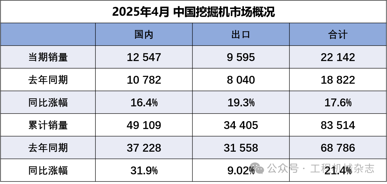 据中国工程机械工业协会对挖掘机主要制造企业统计,2025年4月销售各类挖掘机22142台,同比增长17.6%。其中国内销量12547台,同比增长16.4%;出口量9595台,同比增长19.3%。......