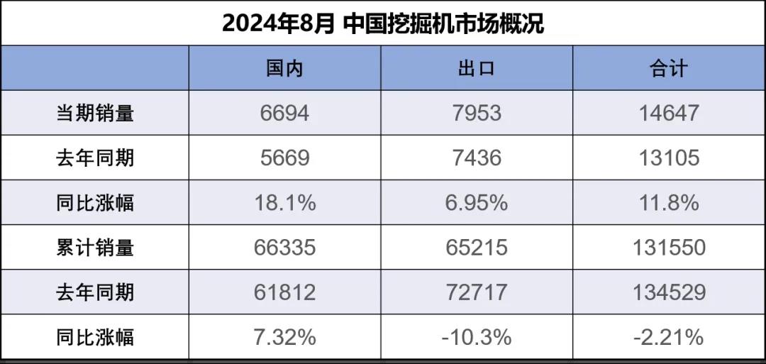 据中国工程机械工业协会对挖掘机主要制造企业统计,2024年8月销售各类挖掘机14647台,同比增长11.8%,其中国内6694台,同比增长18.1%;出口7953台,同比增长6.95%。2024年1—8月,共销售挖掘机131550台,同比下降2.21…......