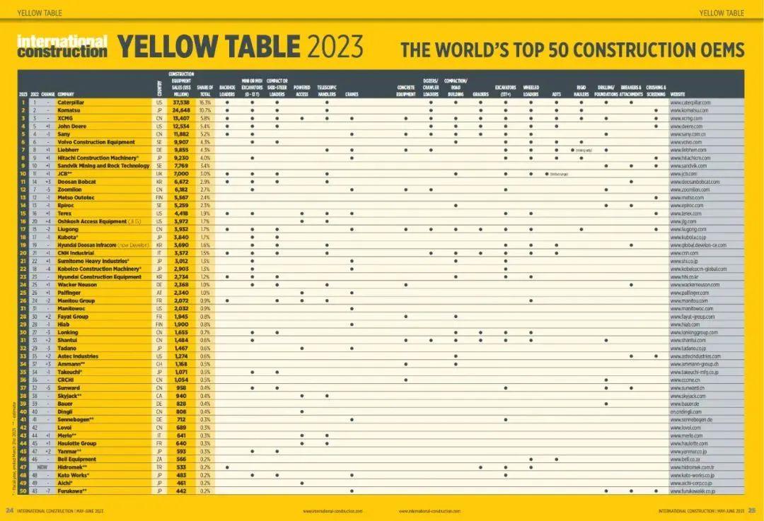 6月1日,全球工程机械行业知名资讯集团KHL旗下《International Construction》杂志权威发布Yellow Table榜单。榜单显示,TOP50工程机械制造商2022年总销售额为2306亿美元,为该榜单有史以来的最高数字之一。增长的一个…......