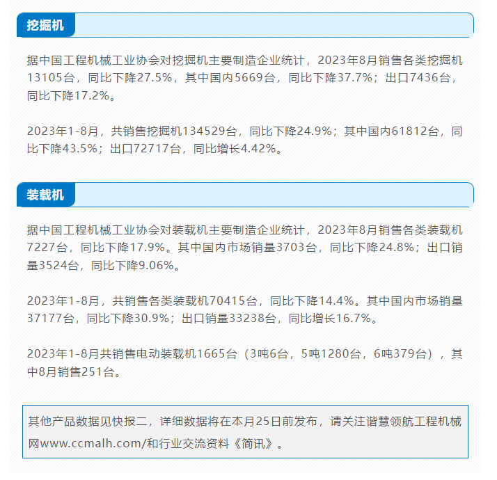 机械工业协会对挖掘机主要制造企业统计,2023年7月销售各类挖掘机12606台,同比下降29.7%,其中国内5112台,同比下降44.7%;出口7494台,同比下降13.8%。2023年1-7月,共销售挖掘机121424台,同比下降24.6%;其中国内…......