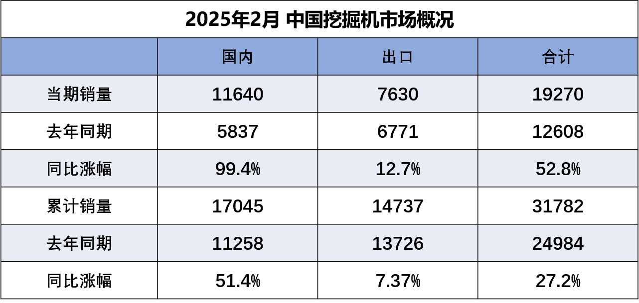 据中国工程机械工业协会对挖掘机主要制造企业统计,2025年2月销售各类挖掘机19270台,同比增长52.8%。其中国内销量11640台,同比增长99.4%;出口量7630台,同比增长12.7%。2025年1—2月,共销售挖掘机31782台,同比增…......