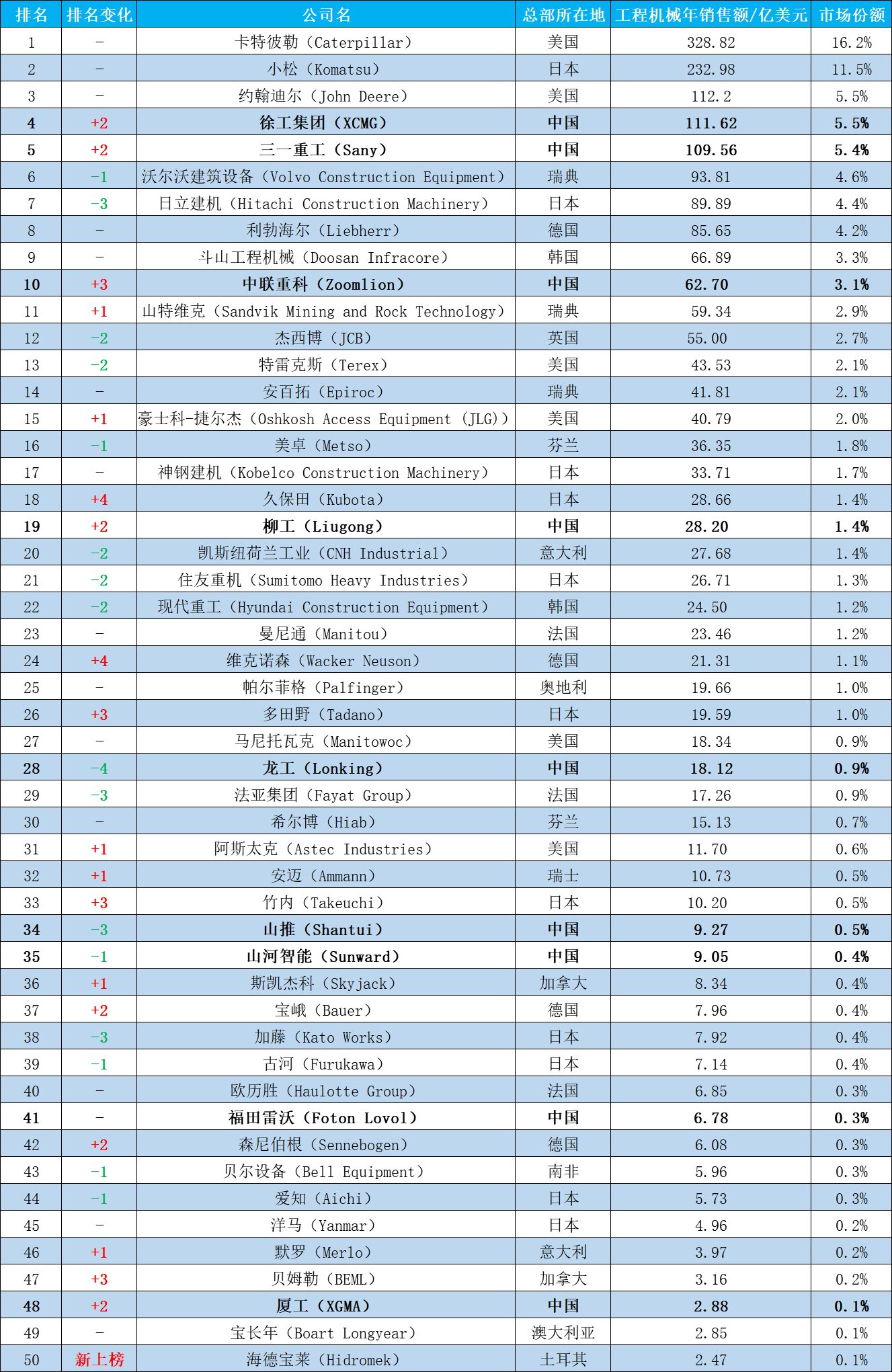 榜单显示,上榜的50家工程机械主机制造商2019年销售总额为2027.27亿美元,是该榜单自发布以来首次总销售额突破2000亿美元。