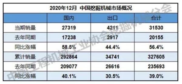 2020年12月,共计销售各类挖掘机械产品31,530台,同比涨幅56.4%。国内市场销量27,319台,同比涨幅58.5%。出口销量4,211台,同比涨幅44.4%。