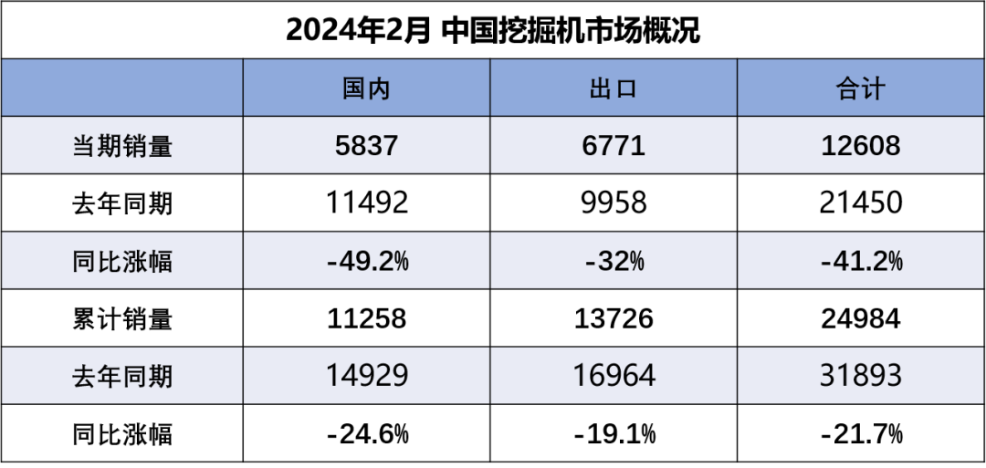 据中国工程机械工业协会对挖掘机主要制造企业统计,2024年2月销售各类挖掘机12608台,同比下降41.2%,其中国内5837台,同比下降49.2%;出口6771台,同比下降32%。